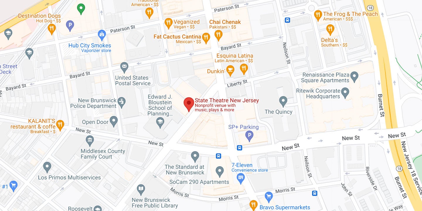 State Theatre New Jersey is located in the heart of downtown New Brunswick at 15 Livingston Avenue between George Street and New Street. State Theatre is easily reached by car or public transportation.
