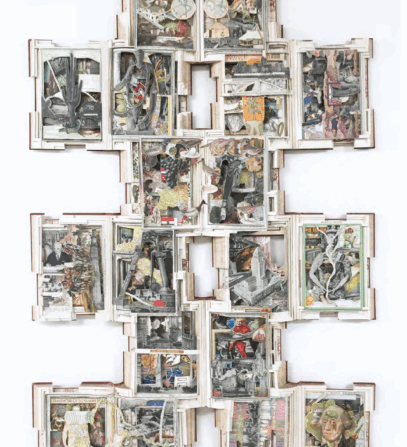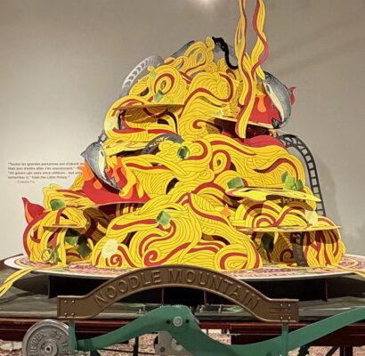 Gallery Artwork Caption: Colette Fu, Noodle Mountain, 2024. Pop-up book on wood platform with metal opening crank, 10 x 10 x 10 ft. Image courtesy of the artist. Brian Dettmer, The World At Home, 2019. Hardcover books, acrylic varnish, and pedestal, 47 x 30 x 2.5 inches. Image courtesy of the artist. Diana Schmertz, 1836 Project, 2022. Laser cut ink and watercolor paintings on paper, 29 x 44 inches. Image courtesy of the artist.